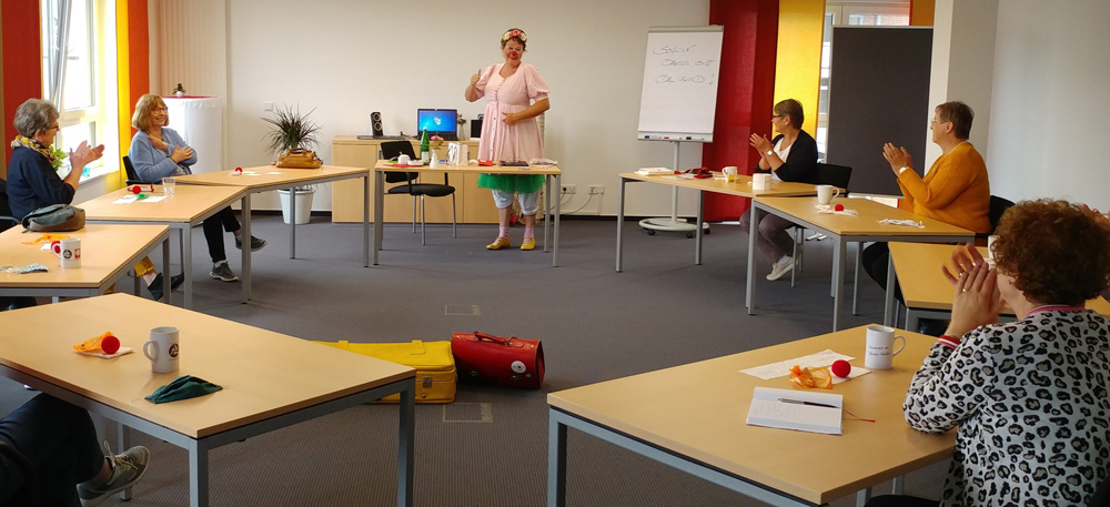 Als Clown Pfefferminze verkleidet huschte Anne Schwede verschämt in den Seminarraum. Augenblicklich stellte sich eine staunende Aufmerksamkeit ein, eine gewisse Leichtigkeit. Kopf und Theorien waren erstmal ausgeschaltet. Alles andere war für den Moment wie weggeblasen. So lernten die Teilnehmer*innen was vielleicht das Schwerste ist, ganz im Augenblick und im Kontakt zu sein. Das konnten sie an Hand von Mitmachübungen ausprobieren.
